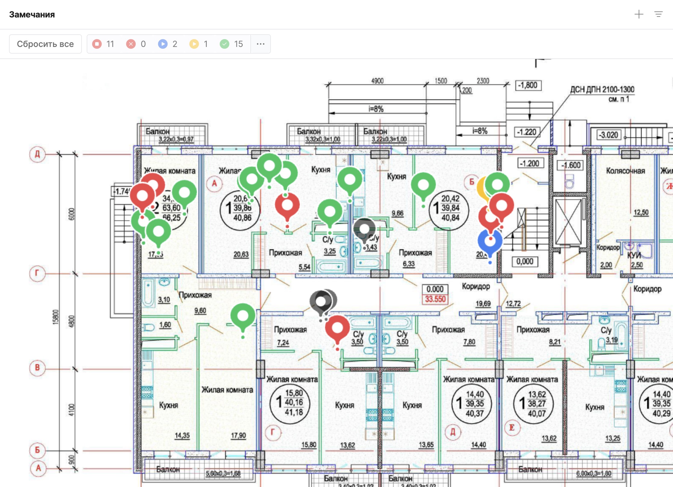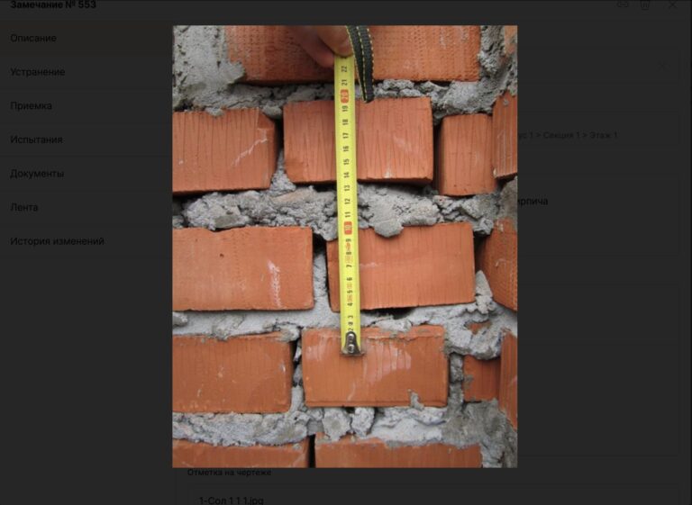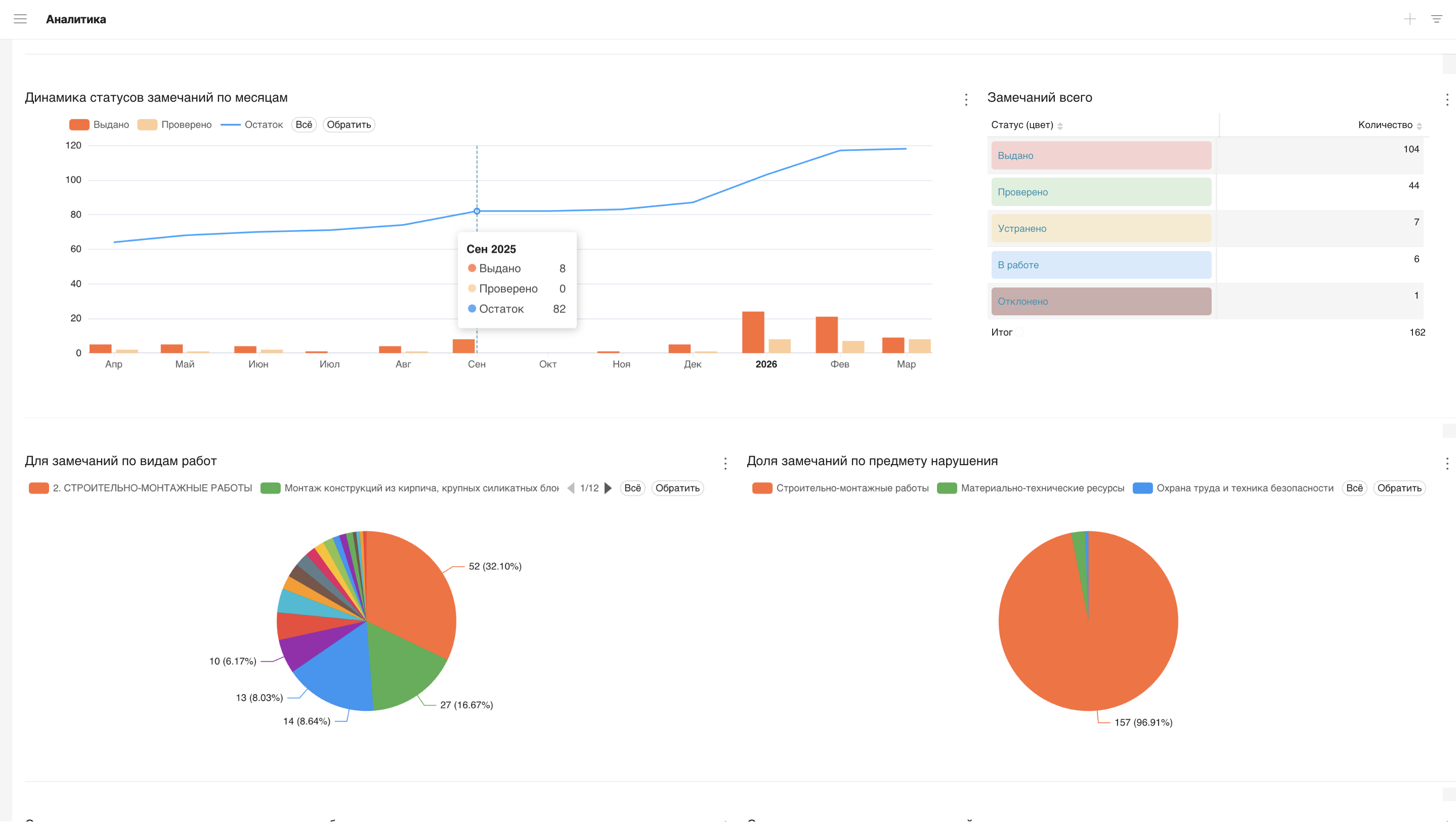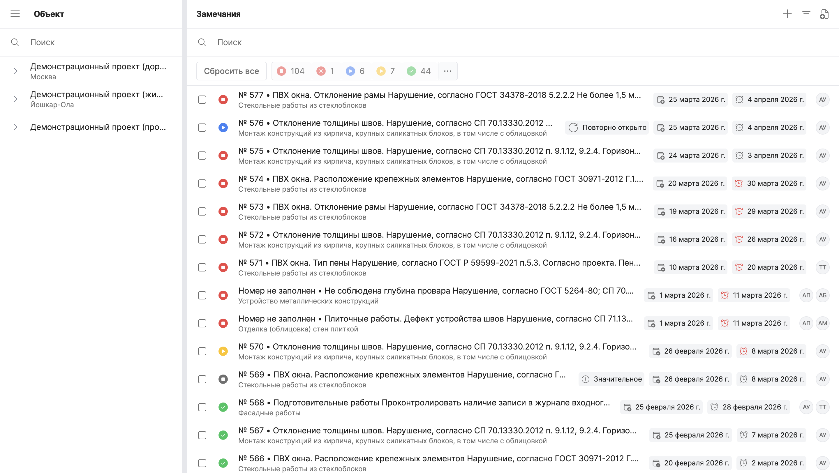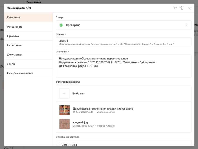 Дефекты, выявленные при приёмке, автоматически попадают в модуль управления замечаниями. Полный цикл контроля без ручного переноса.