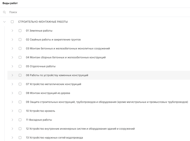 Классификатор видов работ в программе соответствует перечню сооружений, конструкций и работ, подлежащих строительному контролю из свода правил